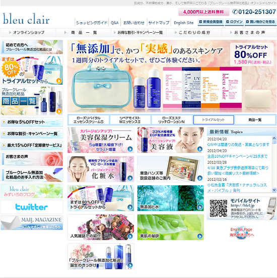 肌成分、天然植物成分、湧水、そして無添加にこだわる「ブルークレール無添加化粧品」オフィシャルサイトで弊社は、カード決済の与信管理、ショッピングカートなどの受注管理と宅配業者への配送管理を開発致しました。